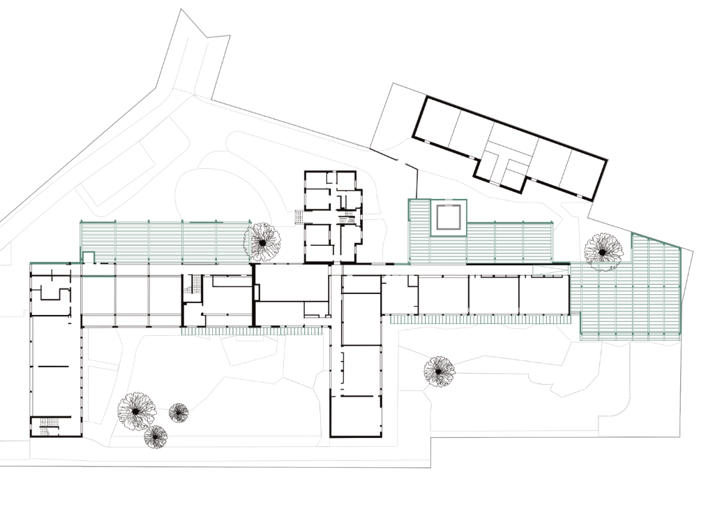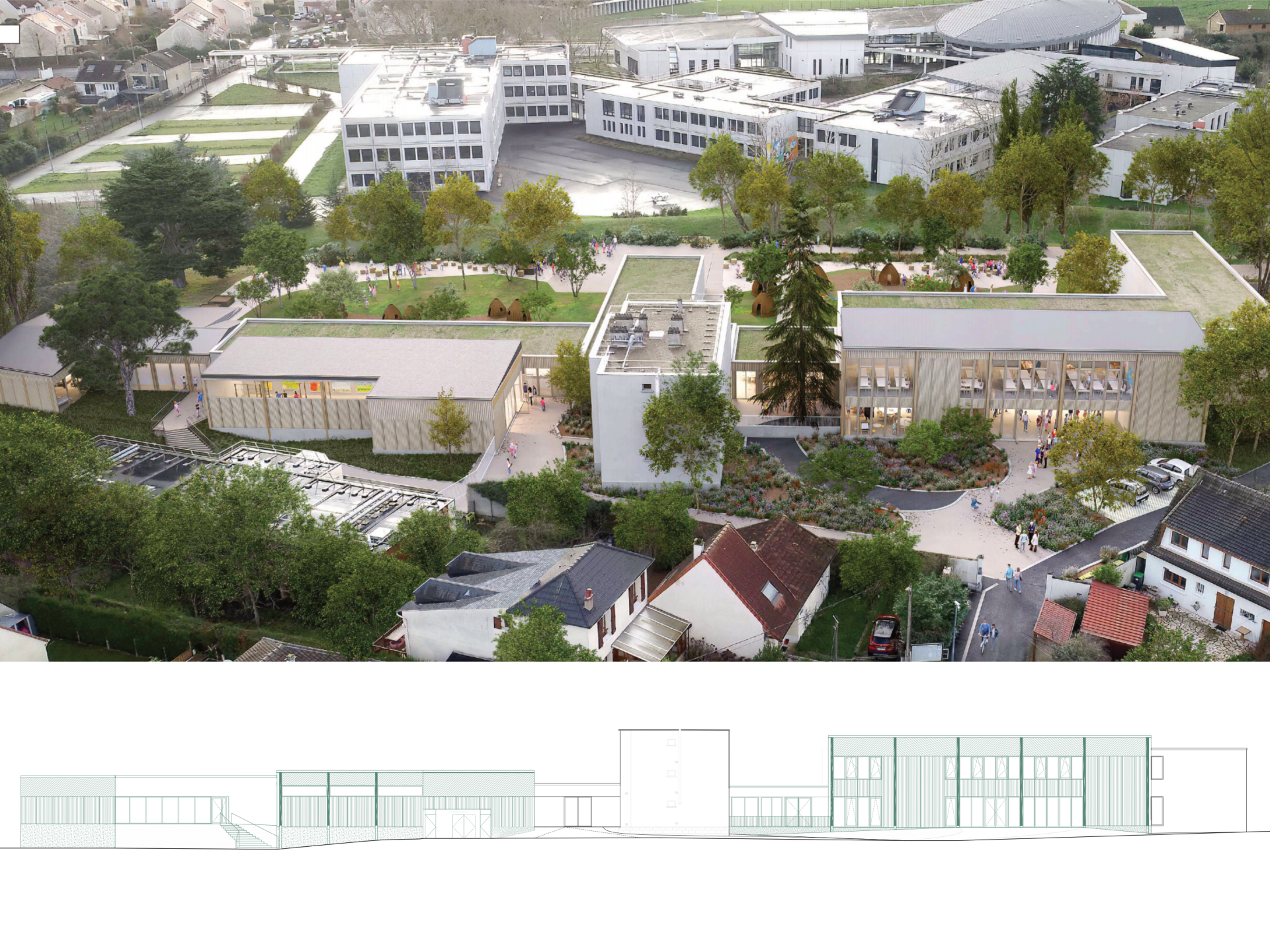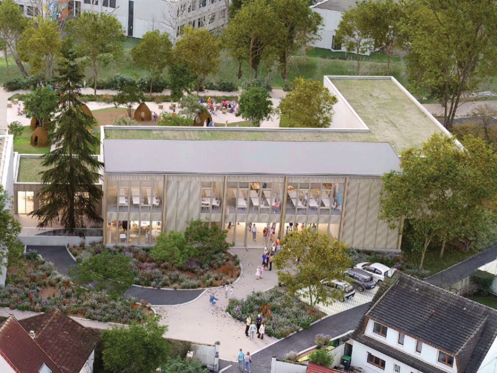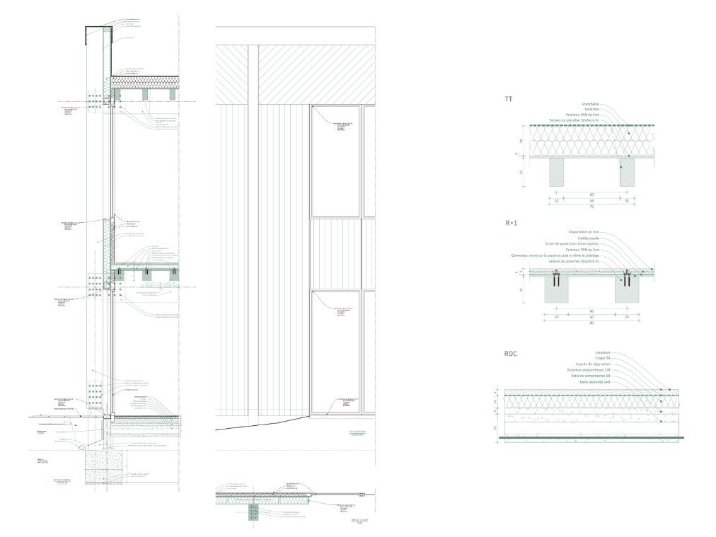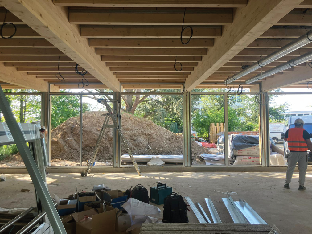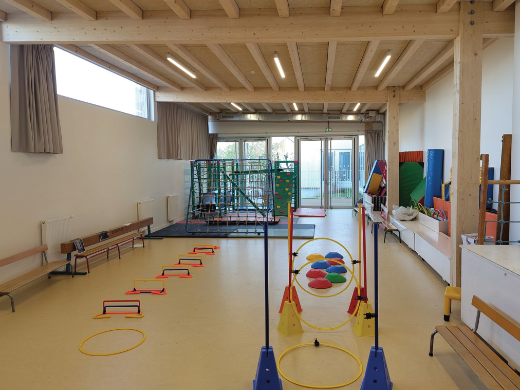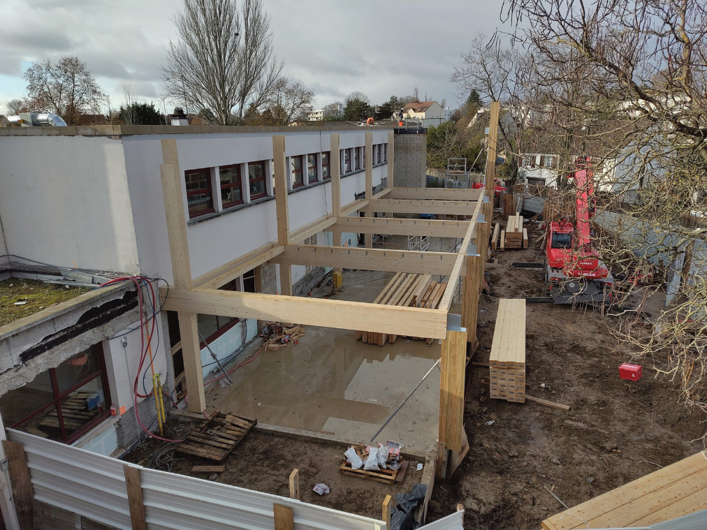 Cette opération d’extension et de réhabilitation a lieu en site occupé et se déroule sur trois ans de travaux. Les extensions sont réalisées en structure poteau-poutre bois avec des remplissages de façade en ossature pour le contreventement. Deux extensions sont de plain-pied. La troisième est en R+1. Le plancher intermédiaire est un plancher mixte bois-béton.